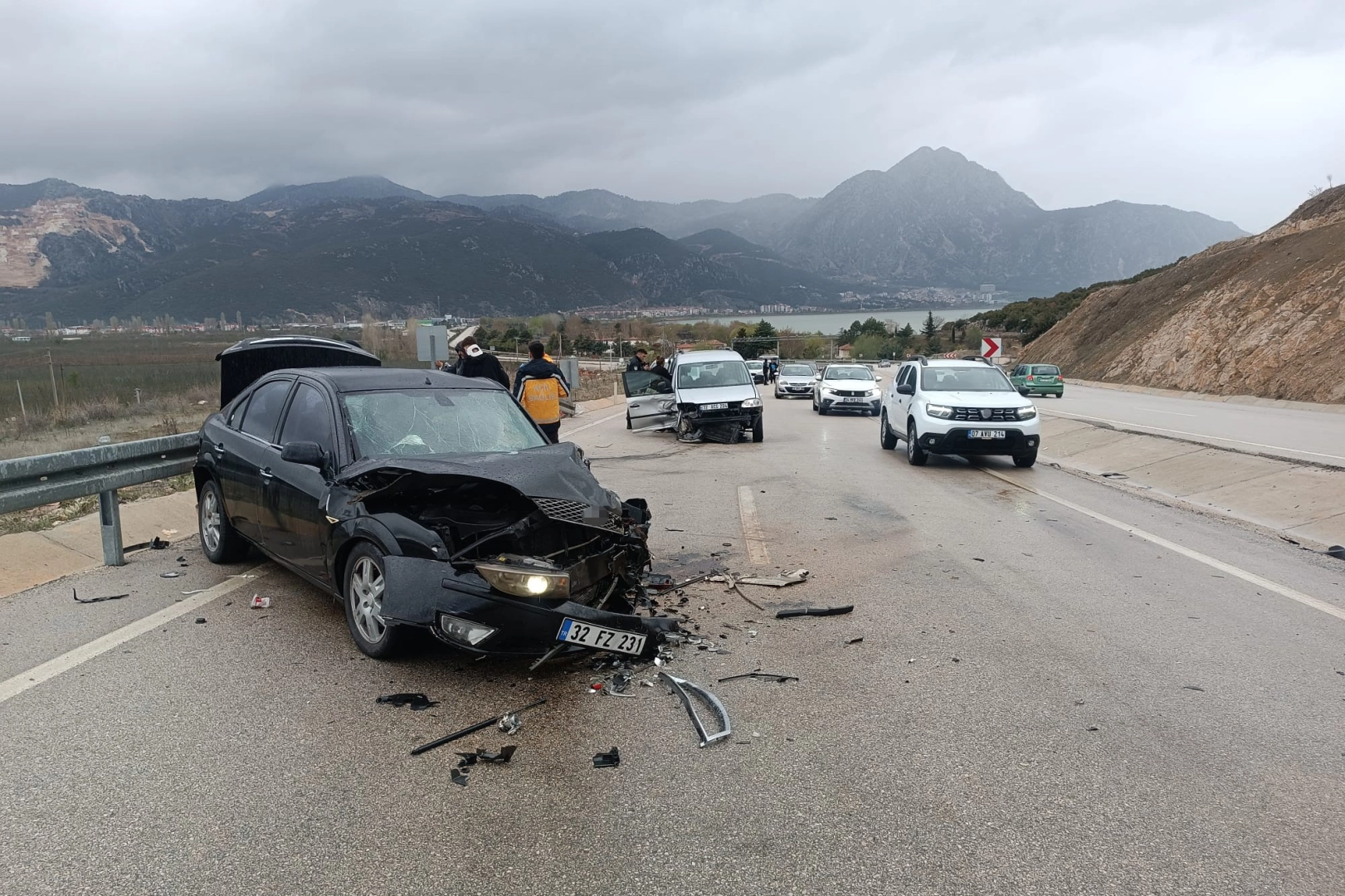 Kaza, öğle saatlerinde Eğirdir ilçesi Isparta-Konya Karayolu üzerindeki Konya Bucağı Mezarlığı mevkiinde meydana geldi. Edinilen bilgilere göre, İsmet A. idaresindeki 32 ACG 204 plakalı Volkswagen marka hafif ticari araç, yağmur nedeniyle kayganlaşan yolda kontrolden çıkarak karşı şeride geçti. Bu sırada hafif ticari araç, karşı yönden gelen Ercan K. yönetimindeki 32 FZ 231 plakalı otomobille kafa kafaya çarpıştı. 8 kişi yaralandı Kazada, hafif ticari araç sürücüsü İsmet A. ile araçta yolcu olarak bulunan Zeynep A., Ali Hakan A., İhsan A., Selda A. ve Ayşe Y., otomobil sürücü Ercan K. ile yolcu Faden K. yaralandı. Durumu ağır 3 kişi Isparta'ya sevk edildi Kazayı görenlerin 112 Acil Çağrı Merkezi'ne ihbarı üzerine olay yerine polis ve sağlık ekipleri sevk edildi. Yaralılar, sağlık ekiplerinin ilk müdahalesinin ardından ambulanslarla hastanelere kaldırıldı. Durumları ağır olan Ayşe Y., Zeynep A. ve Selda A. tedavileri için Isparta'ya sevk edildi. Kazayla ilgili inceleme başlatıldı.