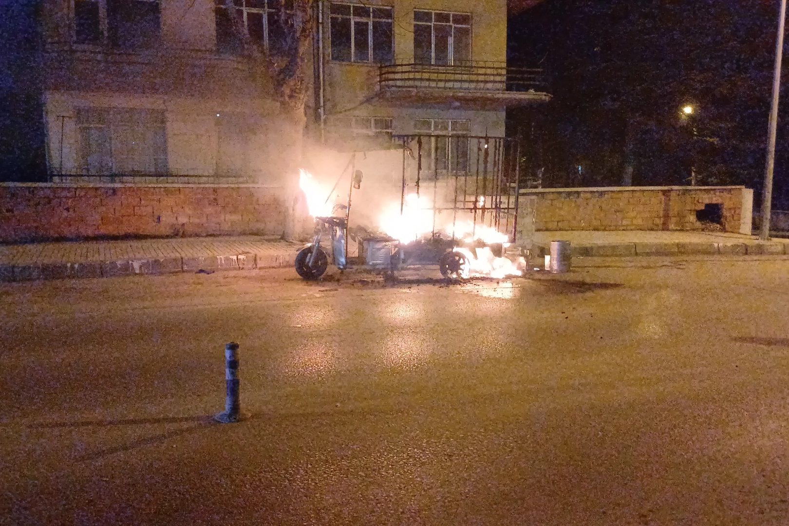 Olay, Ekin Caddesi’nde meydana geldi. Edinilen bilgiye göre, İmdat Çördük’e ait 3 tekerlekli, elektrikli ve kasalı motosiklette park halindeyken bilinmeyen sebeple yangın çıktı. Kısa sürede büyüyen yangın motosikleti sardı. Yangını gören vatandaşlar durumu 112 Acil Çağrı Merkezi’ne bildirdi. İhbar üzerine olay yerine gelen itfaiye ekiplerinin müdahalesi ile yangın söndürüldü. Alev alev yanan motosikletten geriye ise iskeleti kaldı. Yangını elindeki güğümdeki suyla söndürmeye çalışan motosikletin sahibi gözyaşlarına hakim olamadı. Polis ekipleri yangınla ilgili inceleme başlattı.