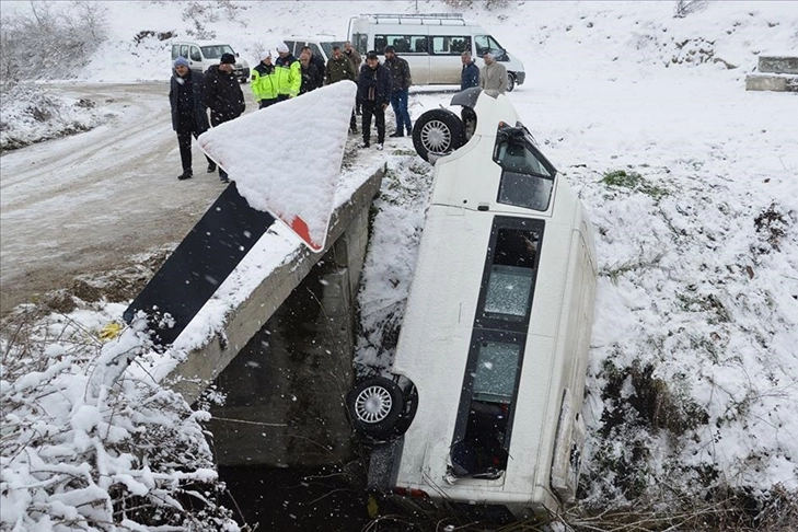 Samsun'daki cenaze törenine katılmak üzere İstanbul'dan yola çıkanların bulunduğu Sinan Keskin idaresindeki 34 AV 7345 plakalı minibüs, kar yağışı nedeniyle kayganlaşan Şeyhali mevkisindeki Kavaklı Çayı üzerinde bulunan köprüden çay yatağına devrildi.