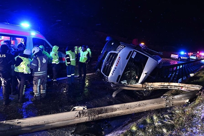 Kuzey Çevre Otoyolu Boğazköy İstiklal mevkisinde İstanbul Havalimanı istikametine seyir halindeki F.S. idaresindeki 34 LPT 868 plakalı servis minibüsü kar yağışı sonrası kayganlaşan yolda kontrolden çıkıp bariyerlere çarparak devrildi.