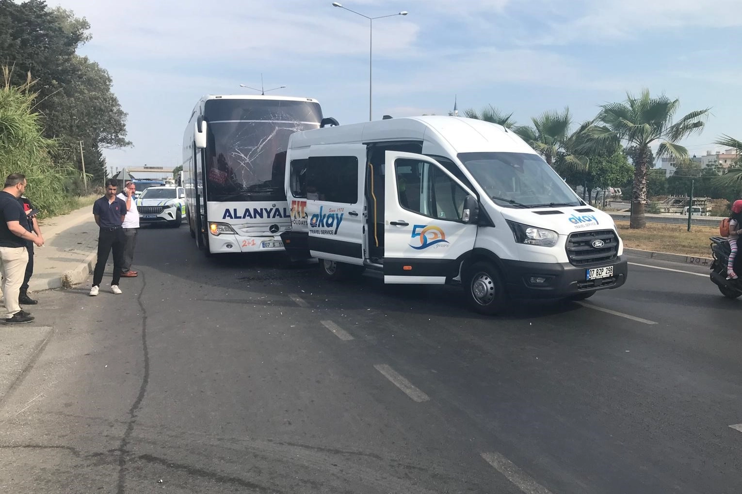 Kaza, dün Manavgat-Alanya D-400 Karayolunda meydana geldi. Edinilen bilgiye göre, Ahmet G. Ö.’nün kullandığı 07 S 1192 plakalı şehirlerarası yolcu otobüsü, Kızılot Mahallesinde aynı istikamette seyir halindeki Recep Y. Y.’nin kullandığı 07 S 1192 plakalı tur minibüsüyle çarpıştı. Kazada, tur minibüsü şoförü ile tur aracında yolcu olarak bulunan Almanya uyruklu Derja M. yaralandı. Sağlık ekiplerinin olay yerindeki müdahalesinin ardından ambulansla hastaneye kaldırılan yaralıların hayati tehlikelerinin olmadığı bildirildi.