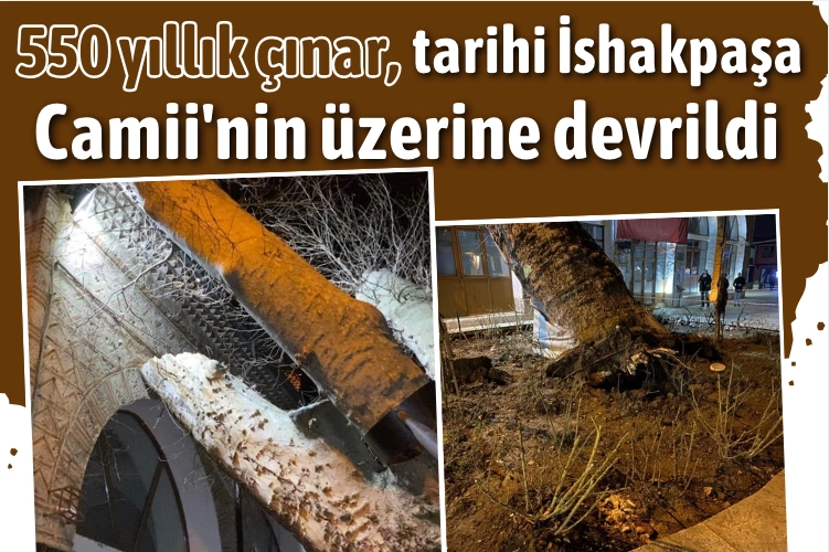 600 yıllık İshakpaşa Camii'nin girişinde bulunan asırlık çınar ağacı kökünden çıkarak devrildi. Caminin duvarına dayanan ağacın gövdesinden parçalar yere düştü. Olay sırasında kimsenin olmaması olası faciayı önledi.