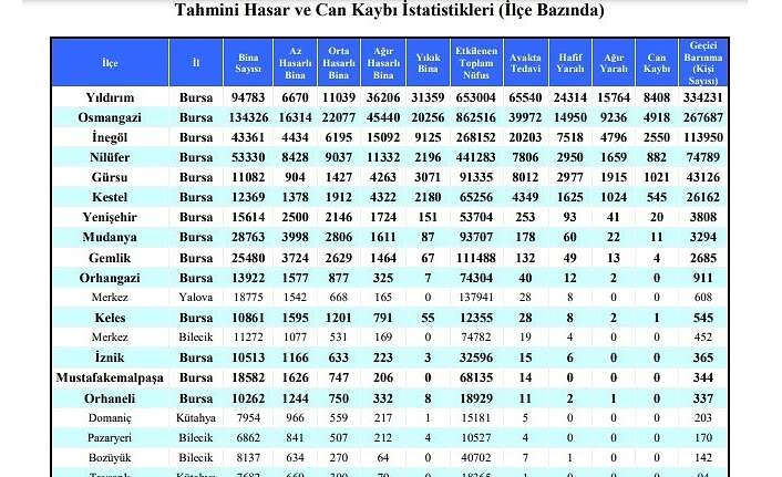 Kahramanmaraş merkezli depremlerin ardından gözler Büyük Marmara Depremine çevrildi. AFAD-RED raporunda Bursa ile ilgili öne çıkan veriler dikkat çekti. 2021 yılında hazırlanan senaryoya göre 6,9 büyüklüğündeki depremde 18 binden fazla kişinin hayatını kaybedeceği tahmin ediliyor. 650 bin konutun olduğu Bursa'da 2004 yılı öncesine ait riskli 200 bin bina bulunuyor. Bursa AFAD Şube Müdürlüğü Bursa'da yaşanabilecek muhtemel afetler için çok detaylı bir rapor hazırladı. Farklı senaryoların uygulanıp sonuçlandırıldığı raporda tatbikatlardan, deprem sonrası toplanma yerlerine, oluşturulacak konteyner kentler, yaşanacak kayıplar ve yıkımlara kadar muhtemel detaylar yer alıyor. İçişleri Bakanlığı Afet ve Acil Durum Yönetimi Başkanlığı tarafından oluşturulan hem gerçek bir depremin hem de senaryo bir depremin oluşturabileceği hasar ve kayba ilişkin sonuçlar üreten AFAD Deprem Ön Hasar ve Kayıp Tahmin Sistemi (AFAD-RED) Türkiye geneli fay haritasına göre Bursa ile ilgili 2 ayrı senaryo oluşturdu. Bu senaryo sonucuna göre Bursa AFAD tarafından da bir rapor hazırlandı. AFAD Deprem Dairesi Başkanlığı ve akademik işbirliği ile geliştirilen AFAD-RED yazılımı ile saat 15.00’da büyüklüğü 6.9 olan bir deprem meydana gelmiş gibi oluşturulan ilk senaryoda; Bursa'da nüfusun en yoğun olduğu ilçeleri etkileyecek fay ve bu fay üzerindeki muhtemel en büyük deprem ihtimal olarak kayda alındı. 6.9 büyüklüğündeki deprem sonrası yaşanacakların analiz sonuçları ve tahmini sismik şiddet haritası çıkarıldı. Oluşabilecek maksimum şiddetteki, yıkıcı depremde Bursa genelinde 18 bin 360 can kaybı yaşanacağı, 34 bin 475 ağır yaralı, 54 bin 564 hafif yaralı vatandaşın olacağı öngörüldü. Depremden etkilenen toplam nüfus Bursa için 2 milyon 872 bin 079 kişi tespit edilirken, Yalova, Bilecik, Kütahya, Sakarya, Eskişehir gibi çevre iller de baz alınarak 3 milyon 216 bin 336 kişinin yıkıcı depremden etkileneceği tahmin edildi. Toplam hasarlı bina sayısı ise 323 bin 977 olarak hesaplandı. Bursa'da 872 bin 367 kişinin geçici barınmaya ihtiyaç duyacağı açıklandı. İlçe bazında ise Yıldırım'da 8 bin 408, Osmangazi'de 4 bin 918, İnegöl'de 2 bin 550, Gürsu'da 1021, Nilüfer'de 882, Kestel'de 545, Yenişehir'de 20, Mudanya'da 11, Gemlik'te 4, Keles'te 1 can kaybı tahmininde bulunuldu. Yıldırım'da 31 bin 359, Osmangazi'de 20 bin 256, İnegöl'de 9. bin 125, Gürsu'da 3 bin 071, Nilüfer'de 2 bin 196, Kestel'de ise 2 bin 180, Yenişehir'de 151, Mudanya'da 87, Gemlik'te 67, Keles'te 55 binanın yıkılacağı öngörüldü. Yıldırım'da 36 bin 206, Osmangazi'de 45 bin 440, İnegöl'de 15 bin 92, Nilüfer'de 11 bin 332 binanın da ağır hasar alacağı da ifade edildi. Senaryoda hasar tespit çalışma grubu ve insan kaynakları kapasitesi 1703 ekip olarak öngörülürken var olan 276 ekip haricinde 1427 ekibe daha ihtiyaç olduğu belirlendi. İkinci senaryo ise Türkiye'de deprem üretme potansiyeli en yüksek olan Kuzey Anadolu Fay Zonunun güney kolunda yer alan İznik-Mekece-Geyve fayının üzerinde meydana gelen Mw: 7.2 büyüklüğündeki deprem senaryosu deprem masası katılımcıları ile değerlendirilerek Bursa'da muhtemel etkileri üzerinden olay tedbir tabloları oluşturuldu. Deprem senaryolarının ardından Bursa AFAD tarafından hazırlanan raporda Bursa'da depreme neden olabilecek en önemli fay; doğuda Derekızık-Burhaniye köyleri ile batıda Uluabat gölü arasında uzanan yaklaşık 45 kilometre uzunlukta olan Bursa fayı olarak gösteriliyor. Ayrıca Bursa’yı etkileyecek diğer faylar ise Marmara Denizi'ndeki fay, Geyve - İznik - Gemlik fayı, Yenişehir - Bursa - Manyas fayı olarak belirtildi. AFAD’ın hazırladığı raporda sadece deprem yer almadı bunun yanında Heyelan, endüstriyel felaket, sel baskını gibi Bursa için riskli bir çok konuya değinildi. Rapora göre; Bursa'da yaşanan deprem dışındaki afet olayları incelendiğinde heyelan, su baskını, kaya düşmesi ve çığ dikkat çekti. Heyelan Bursa ilinde en sık görülen afet türü olup heyelanların en sık gerçekleştiği ilçeler İnegöl, Orhangazi ve Gemlik' olarak belirtildi. Marmara, Sakarya ve Susurluk Havzaları'nda yer alan Bursa’da heyelandan sonra en sık gözlemlenen afet türü ise su baskını olarak belirlendi. Su baskınlarının İnegöl, Yenişehir, Karacabey ve Mustafakemalpaşa ilçelerinde görüldüğü bildirildi. Diğer afet türlerinden en çok görüleni kaya düşmesi, Bursa'da 1950 yılından bu yana 13 adet kaya düşmesi olayı ve 2 adet çığ olayı gözlemlendiği anlatıldı. Diğer bir önemli konu da raporda yer alan İnsan Kaynaklı (Teknolojik) Afetlere de dikkat çekilmesi. Yine raporda kuraklık konusu da afet çerçevesinde değerlendirildi. AFAD’ın Bursa için hazırladığı raporda, senaryo ve tedbirlerde muhtemel bir durumda Bursa merkez ile 17 ilçesinin çadır başta olmak üzere acil toplanma alanları, çadırkentler ve konteynerkentler hem nüfus hem de sayı olarak verildi. Acil Toplanma Alanı olarak 321 mahalle için 880 bölge ayrıldığı görülürken ilçe bazında ise Orhangazi 6 mahallede 19 toplanma alanı, Gemlik 15 mahallede 38 toplanma alanı, İznik 5 mahallede 15 toplanma alanı, Mudanya 8 mahallede 20 toplanma alanı, Osmangazi 92 mahallede 238 toplanma alanı olarak ayrılmış olduğu gösterildi. Çadırkent konusu ise AFAD Bursa raporunda Acil Çadırkent ve Çadırkent olarak iki ayrı bölümle ele alındı. Acil Çadırkent için planlanan rakamlarda Bursa geneli için toplam 315 acil çadırkent, 4 milyon 15 bin 319 metrekarede kişi başı 10 metrekarelik alanlarda 68 bin 654 çadır ve 90 bin 570 kişi olarak açıklandı. Muhtemel bir afette Çadırkent verilerinde ise Bursa genelinde toplam 1 milyon 484 bin 684 metrekarelik alanda 15 çadırkent, kişi başı 