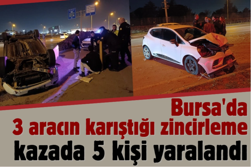 Kaza, dün saat 23.30 sıralarında merkez Osmangazi ilçesi Emek Adnan Menderes Mahallesi Mudanya Yolu üzerinde meydana geldi. 16 AHE 737 plakalı otomobil, 48 ABU 861 plakalı ticari minibüse arkadan çarptı. Çarpışmanın şiddetiyle direksiyon hakimiyetini kaybeden minibüs sürücüsü, 16 BMG 658 plakalı otomobile çarptı. Çarpışmanın etkisiyle 16 BMC 658 plakalı otomobil takla attı. Yaşanan kazada 5 kişi yaralandı. Çevredeki vatandaşların ihbarı üzerine olay yerine polis ve sağlık ekipleri sevk edildi. Sağlık ekiplerinin ilk müdahalesinin ardından yaralılar, Bursa Şehir Hastanesi'ne kaldırıldı. Polis kaza ile ilgili soruşturma başlattı. Metrelerce kuyruk oluştu Kaza sonrası araçlardan kopan parçalar yola saçıldı. Olay yerine gelen polis ekipleri 3 şeritli yolu kapatarak güvenliği sağladı. Mudanya Yolu'nun kapanmasıyla metrelerce uzunlukta trafik oluştu. Bursa Büyükşehir Belediyesi'ne bağlı Ani Müdahale Ekibi olay yerine gelerek etrafa saçılan parçaları temizledi. Yolun güvenli hale getirilmesinin ardından trafiğe açıldı.