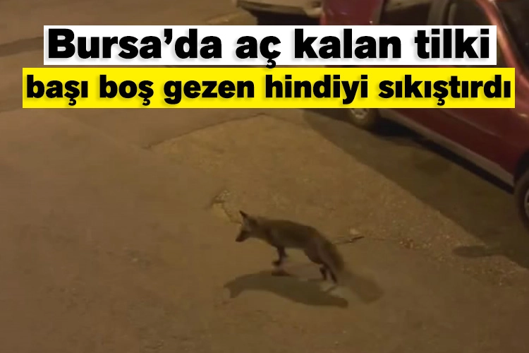 Bursa'nın merkez Nilüfer ilçesi Beşevler Mahallesi’nde kayda alınan görüntüler, izleyenleri şaşkına çevirdi. Aç kalan tilki, şehir merkezinde sokak aralarında gezinmeye başlayınca görenler gözlerine inanamadı. En ilginci ise, tilkinin karşılaştığı ne kedi, ne köpek ne de tavuk oldu. Başı boş sokakta gezen hindiyi gören tilki, yavaştan sokulduğu hindiden beklemediği tepkiyi aldı. Birkaç deneme yapan tilki, başarılı olamayacağını anlaşınca sokaktan uzaklaştı.