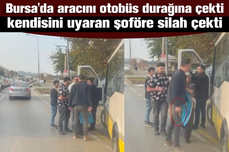 Olay, merkez Osmangazi ilçesi Ankara Yolu Caddesi Sırameşeler mevkiinde meydana geldi. Edinilen bilgiye göre, Şuayip A. işletmesinin önünde bulunan otobüs durağına aracını park etti. Yolcu indirmek için gelen belediye otobüsü ise Şuayip A.'nı aracını çekmesi için uyarıda bulununca taraflar arasında sözlü tartışma çıktı. Tansiyonun artmasıyla silahına sarılan Şuayip A.'yı çevredekiler durdururken, o anlar kameraya yansıdı. Polis harekete geçti Görüntüler üzerine harekete geçen Bursa Asayiş Şube Müdürlüğü Motosikletli Polis Timleri kimliği tespit ettiği şüpheliyi silahla yakaladı. İfadesi alınmak üzere Merinos Polis Merkezine götürülen şüpheli işlemlerinin ardından adli kontrol şartıyla serbest bırakılırken, silaha ise el koyuldu.