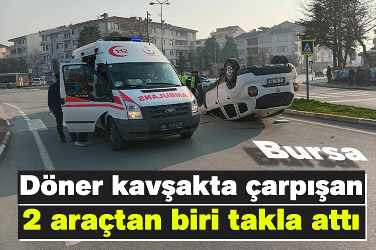 Bursa'da döner kavşakta çarpışan 2 araçtan biri takla attı