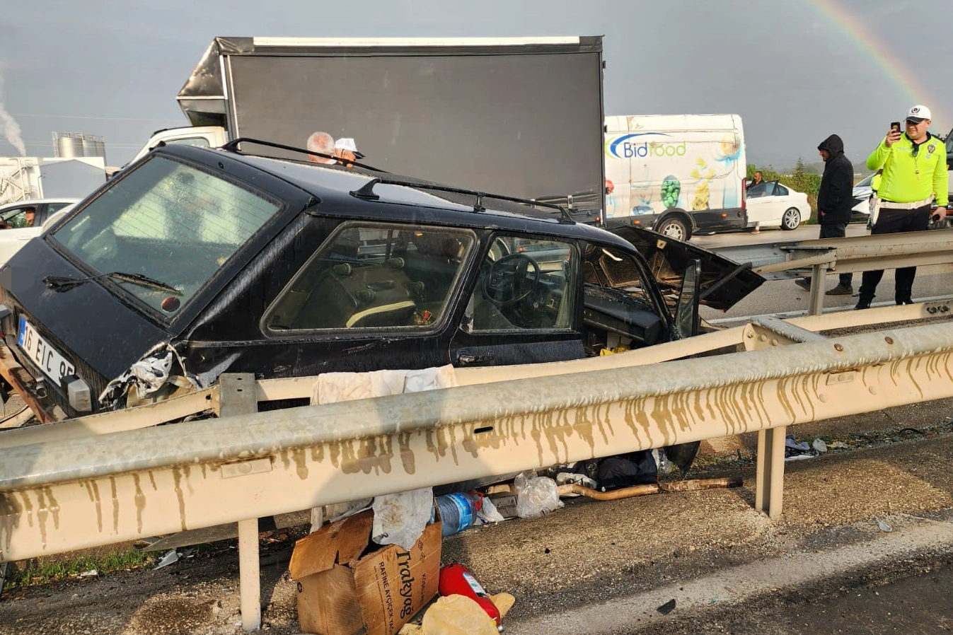 Edinilen bilgiye göre, Bursa istikametinden Mustafakemalpaşa yönüne seyir halinde olan M.Ö. idaresindeki 16 EIC 95 plakalı otomobil, kontrolden çıkarak önce bariyere çarptı ardından refüje savruldu. Kazada sürücü M.Ö., annesi H.Ö., babası Z.Ö. ve ailenin bakıcısı G.Ç. yaralandı. Çarpmanın etkisiyle araç içerisinde sıkışan sürücü, olay yerine sevk edilen itfaiye ekiplerinin yaklaşık 20 dakikalık çalışması sonucu bulunduğu yerden çıkarıldı. Yaralılar, sağlık ekiplerinin ilk müdahalesinin ardından Mustafakemalpaşa Devlet Hastanesi'ne kaldırıldı.