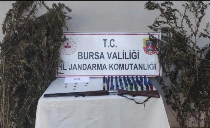 Bursa İl Jandarma Komutanlığı ekipleri tarafından yapılan çalışmalar neticesinde K.A. (44) isimli şüphelinin Hayriye Mahallesi'nde bulunan arazisinde yasadışı kenevir ekimi yaptığı ve kurutarak sattığı tespit edildi. Şahsın Yenişehir ilçe merkezinde bulunan ikametini tespit eden ekipler, baskın yaparak şüpheliyi gözaltına aldı. Şüphelinin iş yeri ve arazisinde yapılan aramalarda ise, boyları 1 ve 2.5 metre arasında değişen kurumaya bırakılmış 24 kök kenevir bitkisi, 1 adet ruhsatsız av tüfeği, 71 adet 12 kalibre av tüfeği fişeği, 7 adet çeşitli dönemlere ait sikke ele geçirildi. Ayrıca şüphelinin iş yerinde yapılan kontrolde 5 Afgan uyruklu şahsın çalışma izni olmadan çalıştığı tespit edilerek, iş yeri sahibi ve çalışanlarına idari para cezası uygulandı. Karakolda işlemleri tamamlanan K.A. sevk edildiği adliyede çıkarıldığı mahkemece adli kontrol şartıyla serbest bırakıldı.