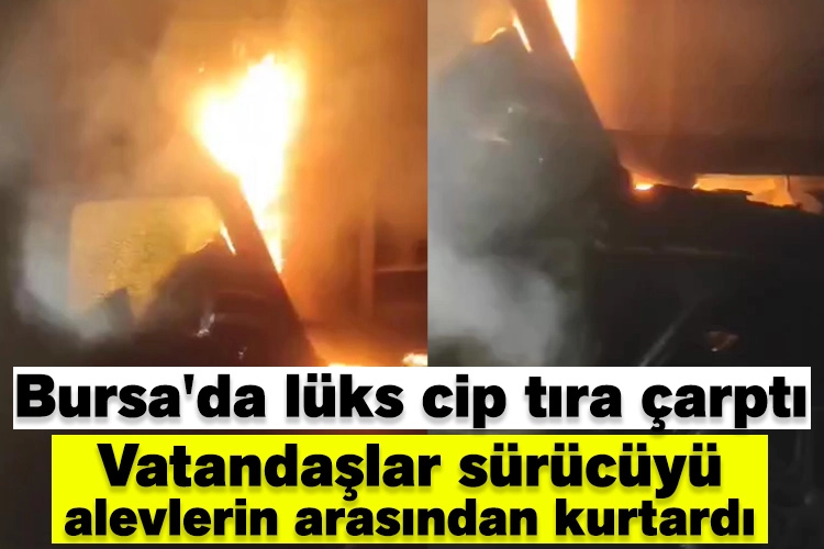 Kaza, gece saat 01.30 sıralarında merkez Nilüfer ilçesi Görükle Mahallesi Gebze-Orhangazi-İzmir Otoyolu'nda meydana geldi. Edinilen bilgiye göre, Y.F.E. idaresindeki 34 YFE 94 plakalı lüks cip, seyir halindeki R.T. yönetimindeki 17 ZF 224 plakalı tıra arkadan çarptı. Çarpmanın şiddetiyle sürücü Y.F.E. bayıldı. Yoldan geçen diğer sürücüler yaralanarak bayılan sürücünün yardımına koştu. O sırada cip alev alırken, vatandaşlar sürücü Y.F.E.'yi zor da olsa sıkıştığı yerden kurtardı. İhbar üzerine bölgeye gelen sağlık ekipleri yaralı sürücüyü ilk müdahalesinin ardından Şehir Hastanesi'ne kaldırırken, itfaiye ekipleri de yanan araca müdahale ederek söndürdü. O anlar, sürücünün yardımına giden bir vatandaşın cep telefonu kamerasına yansıdı. Hastanede tedavi altına alınan cip sürücüsü Y.F.E.'nin hayati tehlikesinin bulunmadığı öğrenildi. Kazayla ilgili soruşturma sürüyor.