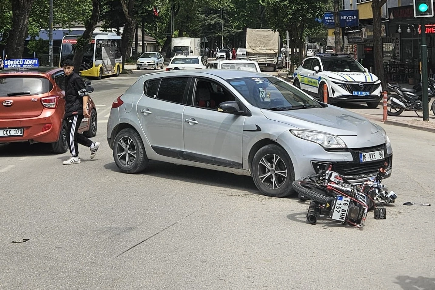 Kaza, saat 13.00 sıralarında Hamidiye Mahallesi Park Caddesi üzerinde meydana geldi. Ömer P. (17) yönetimindeki 16 BHM 157 plakalı motosiklet, seyir halindeyken karşı yönden sokağa dönüş yapan Abdülcebbar E. (26) yönetimindeki 16 KKR 98 plakalı otomobille çarpıştı. Çarpışmanın etkisiyle devrilen motosikletten düşen sürücü yaralandı. Yaralı, kaza yerine sevk edilen ambulansla İnegöl Devlet Hastanesine kaldırıldı. Polis, kazayla ilgili inceleme başlattı.