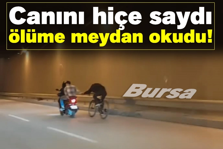 Bursa'da akan trafikte motosikletteki arkadaşına tutunarak ilerleyen bisiklet sürücüsü tehlikeye davetiye çıkardı.