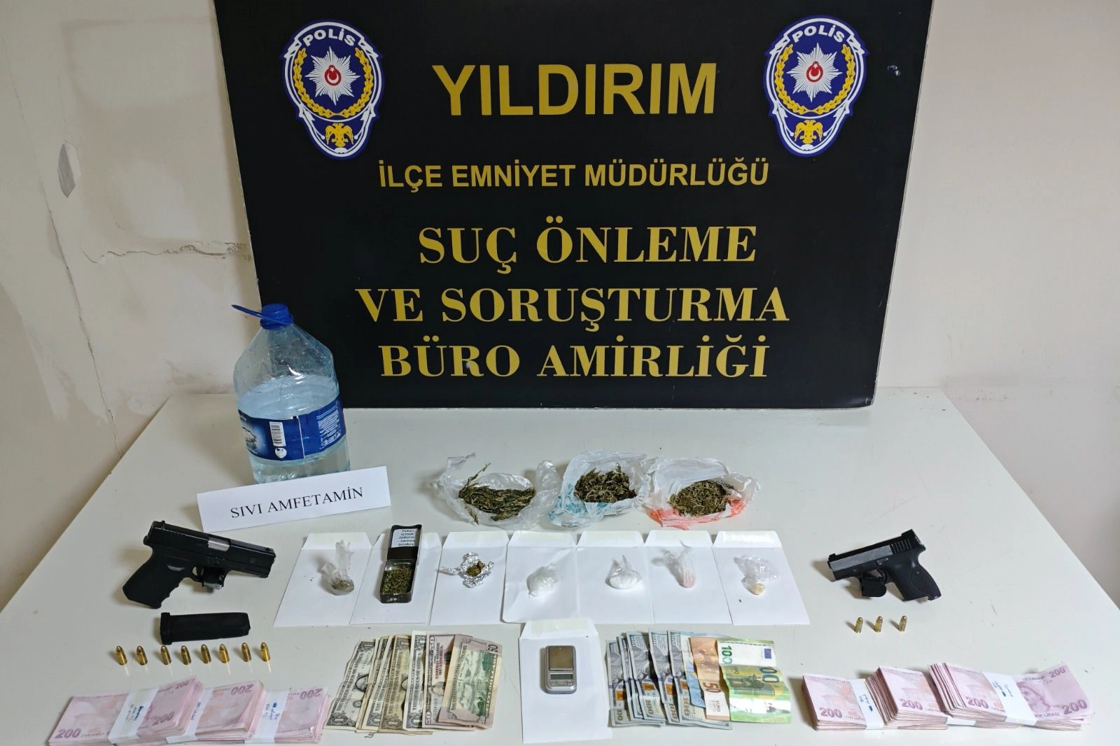 Bursa Emniyet Müdürlüğü Yıldırım İlçe Emniyet Müdürlüğü'ne bağlı Yıldırım Suç Önleme ve Soruşturma Büro Amirliği ekiplerince yapılan çalışmalarda, Yeşil Mahallesi'nde bulunan bir ikamette, hakkında farklı suçlardan 4 yıl 2 ay kesinleşmiş hapis cezası bulunan Yelid A.'nın saklandığı aynı adreste, uyuşturucu madde ticareti yapıldığı ve ruhsatsız silah bulundurulduğu bilgisine ulaşıldı. Uyuşturucu maddelerin pencereden ya da lavabodan dökülmesini engellemek amacıyla ekipler, adrese motorlu kurye kılığına girerek yaklaştı. Şüphelilerin durumu fark etmemesi üzerine ikamete eş zamanlı ve ani baskın düzenlendi. Baskında "Baron Abla" lakaplı Yelid A., koruması ve arkadaşı ile birlikte yakalanırken, evde yapılan aramalarda 2 adet ruhsatsız tabanca ve boş şarjörler, bin 730 mililitre sıvı metamfetamin, çeşitli miktarlarda skunk, sentetik kannabinoid, metamfetamin, eroin, 1 adet hassas terazi ile birlikte 96 bin 600 TL, 807 dolar ve 170 euro nakit para ele geçirildi.