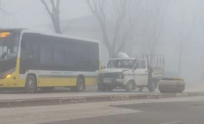 İnegöl ilçesinde gece başlayan sis yoğunluğu, sabahın erken saatlerinde de devam etti. Kırsal alanlardan İnegöl’e gelmek isteyen vatandaşlar, sis sebebiyle zor anlar yaşadı. Trafikte görüş mesafesi 5 metreye kadar düşerken, herhangi bir kazanın yaşanmaması sevindirdi. Trafik ekipleri özellikle sisli havalarda sürücülerin yavaş ve kontrollü bir şekilde seyir etmeleri konusunda uyarılarda bulunuyor. Adnan Menderes Bulvarı üzerinde sis sebebiyle maddi hasarlı kaza meydana geldi. Adnan Menderes Bulvarı üzerinde seyir halinde olan halk otobüsüne, arkasından gelen kamyonet çarptı. Şans eseri yaralanan olmadı.