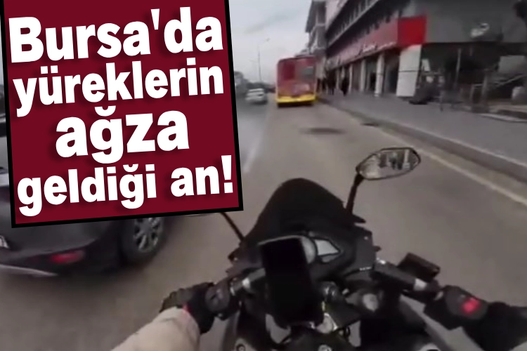 Olay, merkez Yıldırım ilçesi Ankara yolu üzerinde meydana geldi. Biranda hızlanan motosiklet sürücüsü, otobüse çarpmamak için solundan giden otomobilin önüne geçtiği an direksiyon hakimiyetini kaybetti. Sağa ve sola doğru yalpalayan motosiklet, sürücüsü kısa bir süre sonra direksiyonu toplamasıyla yoluna devam etti. Yaşanan korku dolu anlar, motosikletlinin kask kamerasına yansıdı.