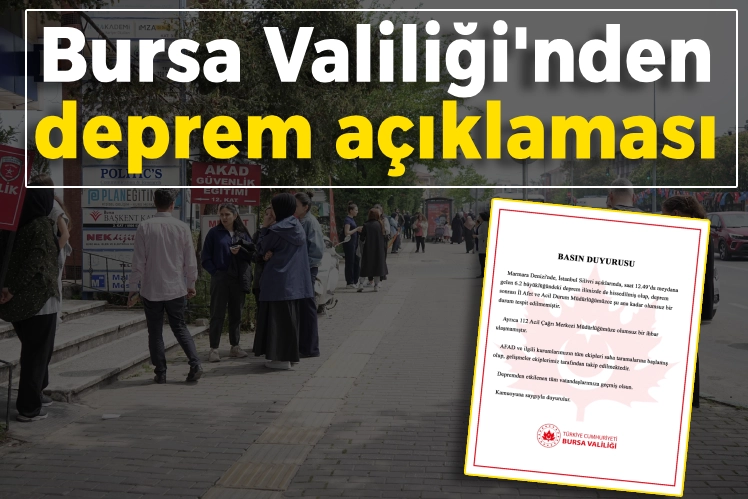 Bursa Valiliği'nden yapılan açıklamada, "Marmara Denizi'nde, İstanbul Silivri açıklarında, saat 12.49’da meydana gelen 6.2 büyüklüğündeki deprem ilimizde de hissedilmiş olup, deprem sonrası İl Afet ve Acil Durum Müdürlüğümüzce şu ana kadar olumsuz bir durum tespit edilmemiştir. Ayrıca 112 Acil Çağrı Merkezi Müdürlüğümüze olumsuz bir ihbar ulaşmamıştır. AFAD ve ilgili kurumlarımızın tüm ekipleri saha taramalarına başlamış olup, gelişmeler ekiplerimiz tarafından takip edilmektedir. Depremden etkilenen tüm vatandaşlarımıza geçmiş olsun. Kamuoyuna saygıyla duyurulur" denildi.