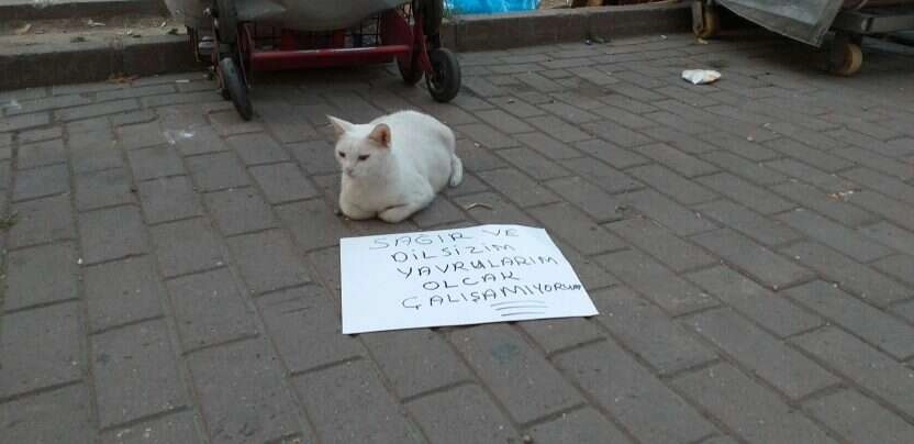 Bursa'da vatandaşlar, hamile sokak kedisine mama alabilmek için pankart hazırladı. Pankartın başında oturan kedi ise ilginç görüntüler oluşturdu. Vatandaşlar, sokak kedisine sahip çıkarak Tekir adını taktı. Vatandaşlar, gebe olan Tekir'e mama alabilmek için farklı bir yola başvurdu. Kediyi sokakta oturmaya alıştıran mahalle sakinleri, önüne de "Sağır ve dilsizim. Yavrularım olacak, çalışamıyorum" yazılı pankart koydular. Kedi ise saatlerce gelen geçenden rahatsız olmadan bu pankartın başında oturuyor. Kediyi ve pankartı gören bazı vatandaşlar meraklı gözlerle izlerken, bazıları da para yardımında bulunuyor. (İHA)