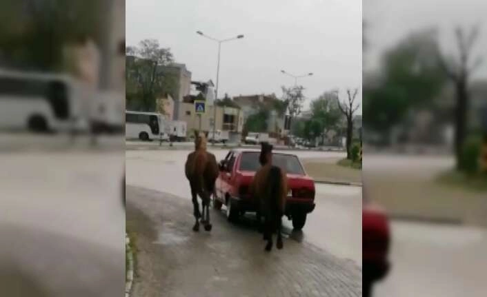 İnsanlık kalmamış dedirten görüntüler, Bursa’da kayda geçti. İki atı otomobille götürmek isteyen kişiler pes dedirten görüntüler ortaya koydu. Atları boyunlarından bağlayan kişiler, otomobilin camlarından tuttukları iplerle kilometrelerce gitti. Tepkilere aldırmayan sürücü ve yanındaki kişi o şekilde yoluna devam etti. O sırada yoldan geçen başka bir sürücü ise o anları cep telefonuyla kaydetti.