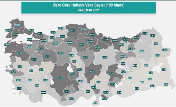 Sağlık Bakanlığı, illere göre haftalık vaka sayısını açıkladı. Bursa'nın haftalık vaka sayısı 159,68 oldu.