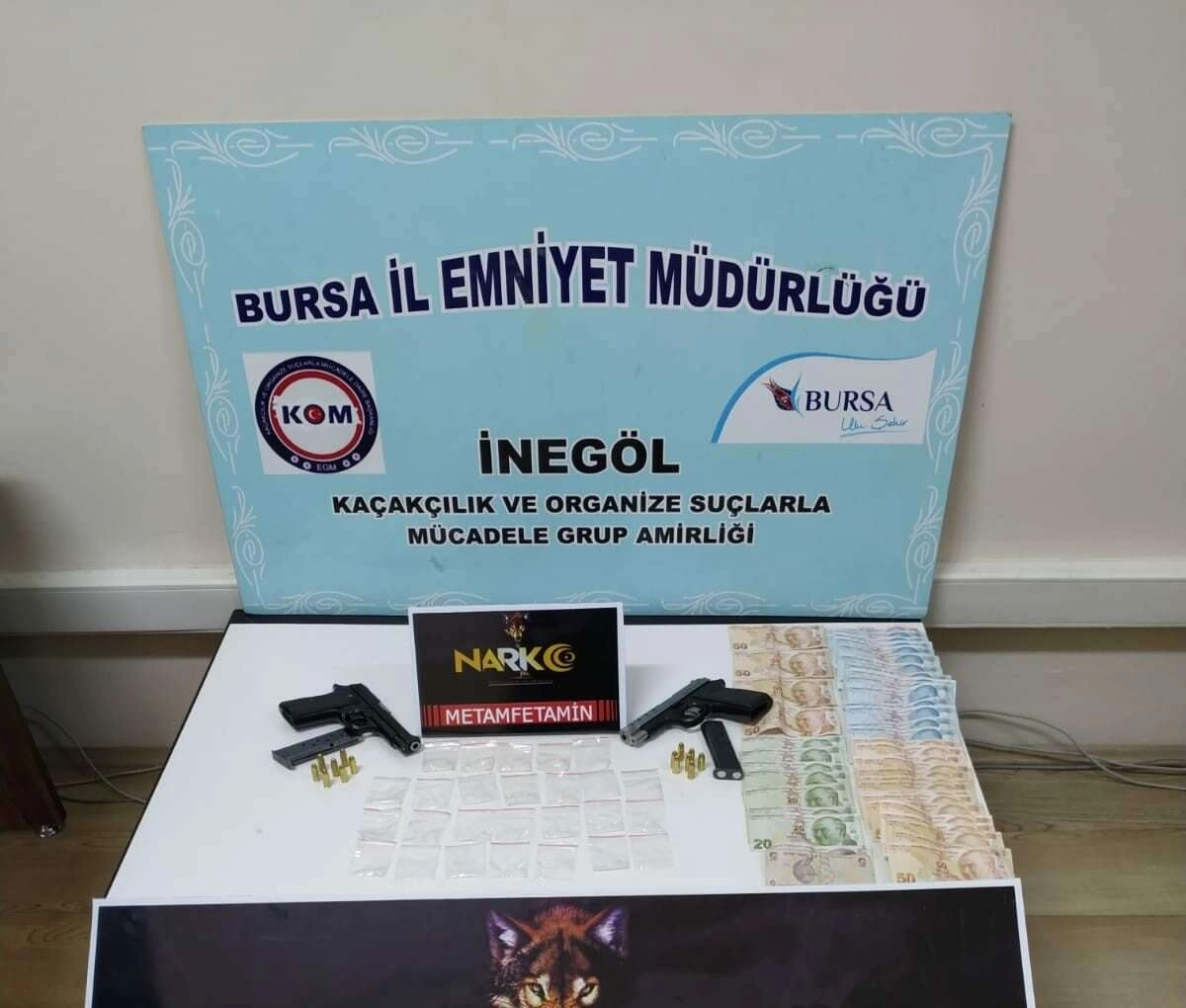 Bursa'nın İnegöl ilçesinde Emniyet Müdürlüğüne bağlı tüm ekipler ilçenin farklı noktalarında sabit ve seyir halinde uygulamalarını aralıksız olarak sürdürüyor. Son yapılan uygulamalarda uyuşturucu ve ruhsatsız silahlar ele geçirildi. Kom ekipleri tarafından şüphe üzerinde durdurulan araçlarda yapılan aramalar sonrası şahısların iş yerinde de aramalar yapıldı. Aramalarda 2 adet ruhsatsız silah ve uyuşturucu madde ve uyuşturucu satışından elde edilen bir miktar para ele geçirildi. Ayrıca İnegöl'de göreve başlayan bekçiler de şüphelendikleri şahıslar üzerinde yaptıkları uygulamada çok sayıda bıçak ele geçirdi. Olaylarla ilgili emniyet ekipleri tarafından 9 kişi hakkında yasal işlem yapıldı. (İHA)