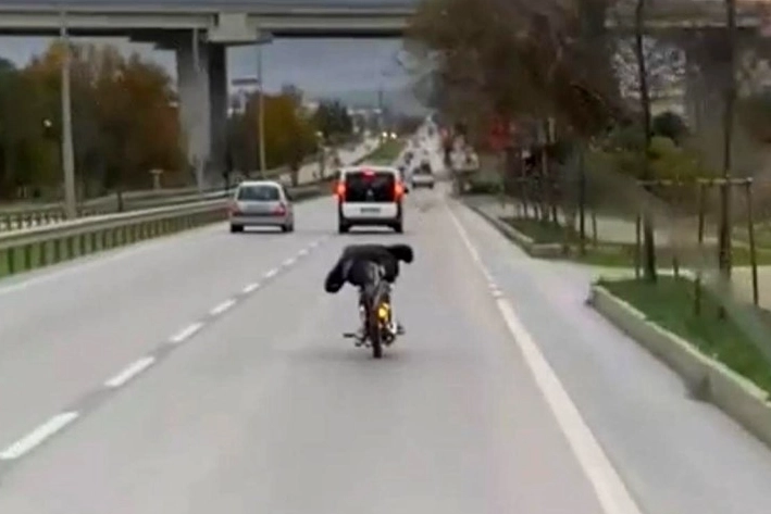 Bursa’nın Osmangazi ilçesi Ovakça mevkiinde meydana gelen olayda, kasksız motosiklet sürücüsü, motosikletiyle ilerlediği sırada yaptığı hareketlerle tehlikeye davetiye çıkardı. Yatarak kullandığı motosikletle adeta ölümle dans eden sürücünün tehlikeli yolculuğu cep telefonu kamerasıyla saniye saniye kaydedildi. Görüntülerde kasksız motosiklet sürücüsünün, iki teker üzerinde yatarak ilerlemesi yer alıyor.