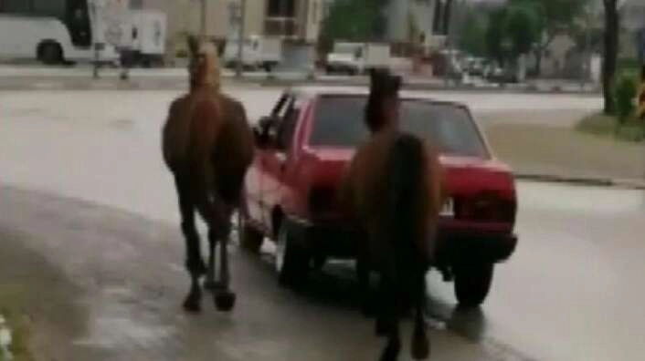 Olay, merkez Yıldırım ilçesinde meydana geldi. Atları boyunlarından bağlayan kişi, otomobilin camlarından bağladığı iplerle kilometrelerce gitti. Tepkilere aldırmayan acımasız sürücü tepkilere aldırış etmeden yoluna devam etti. Atlara eziyet ederek kilometrelerce götüren sürücünün görüntüsü sosyal medyada kısa sürede büyük tepki topladı.