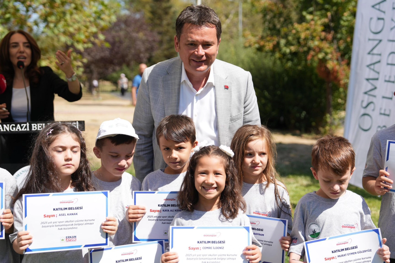 Çocukların yaz tatilini hem verimli hem de eğlenceli geçirmeleri için hazırlanan kursların sonunda Yeni Karaman Yarı Olimpik Yüzme Havuzu'nda sertifika töreni düzenlendi. Törene; Osmangazi Belediye Başkanı Erkan Aydın, belediye başkan yardımcıları, belediye meclis üyeleri ve Osmangazi Belediyespor Kulübü Yönetim Kurulu Başkanı Fatih Karayılan katıldı.