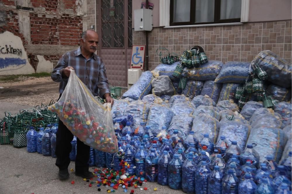 Bursa’nın merkez Osmangazi ilçesinde yaşayan 2 çocuk babası Nazım Gökçe emekli olduktan sonra hayatını yardım işlerine adadı. 2011 yılından bu yana sokak sokak gezerek kapak toplayan yardımsever adam topladığı kapakları biriktirerek geri dönüşüm merkezlerine satıyor. Elde ettiği gelirle engelli dernekleri ve üniversitede okuyan öğrencilere bağışlıyor. Yaklaşık 1 ton ağırlığında kapak toplayan 60 yaşındaki Gökçe, biriktirdiği kapakları evinin önünde sergiledi. Sokak dolusu kapakları satarak tekerlekli sandalye aldığını belirten Gökçe, ilgili derneklere bağışlayarak bir engelliyi sevindirmek istediğini söyledi. Hayatını hayır işlerine adayan Gökçe, “2010 yılında emekli oldum. 2011 yılından bu yana kapak topluyorum. Engellilere yardım ederek başladım. Bir yandan kapak topladım. Tonlarca atığı geri dönüşüme kazandırdım. Topladığım kapaklarla tekerlekli sandalye aldım. Burada 1 milyondan fazla kapak var, ağırlık olarak 1 ton civarında. Bu kapakları 2 senede topladım. Daha önceki yıllarda 1 milyon kapağı 3 yılda toplamıştım. Bu güne kadar toplam 6 ila 7 milyon arası kapak topladım. Hep tek başıma mücadele ettim. Bazen 20 kilometre gidip geldiğim günler oldu. Kapakları geri dönüşümcülere satıyorum. Elde ettiğim parayla tekerlekli sandalye alıyorum. Birazını da kendi cebimden veriyorum. Bu güne kadar 4 tekerlekli sandalye aldım. Engellilere yardım amaçlı aldığım için bana indirim de yapıyorlar. Elimden geldiğimce herkese yardım ediyorum” şeklinde konuştu.
