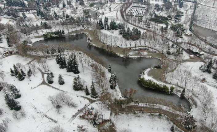Bursa’da her yıl bahar ve yaz aylarında dolup taşan Botanik Park, kar yağışının ardından sessizliğe gömüldü. Park içindeki havuzun büyük kısmı donarken, ördek ve martılar havuzun donmayan yerinde yüzdü. Köpekler ve diğer kuşlar ise boş parkta objektiflere yansıdı. Bursa’da yeşil kuşak kapsamında şehre bol oksijen, yeni dinlenme ve sağlıklı spor alanları kazandırmak maksadıyla 1998 yılında Botanik Parkı hizmete açıldı. Botanik Park 400 bin metrekarelik alanında yer alan, 150 türden 8 bin ağaç, 76 türden 100 bin çalı, 20 türden 50 bin yer örtücü barındırıyor. Parkta, Japon bahçesi, İngiliz bahçesi, Fransız bahçesi, gül bahçesi, açelya-orman gülü bahçesi, kokulu bitkiler bahçesi, kaya bahçesi, renk bahçeleri, şekilli bitkiler bahçeleri yer alıyor. Parkta 12 bin metre doğal yürüyüş yolları, doğal koşu yolu, 1 kilometre soğuk asfalt kaplamalı bisiklet yolu ve göletler yer alıyor. Parkın karlar altındaki görüntüsü drone ile havadan da görüntülendi.