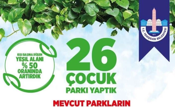 ‘Bugüne Nefes, Yarınlara Umut Oluyoruz’ sloganı ile yola çıkılan Yenişehir’de 3 yılda yeni 68.403 m2 yeşil alan Kazandırıldı. Konuyla ilgili açıklama yapan Yenişehir Belediye Başkanı Davut Aydın, “İlçemize 2019-2022 Yılları Arasında 68.403 m2 Yeşil Alan Kazandırdık. Kişi başına düşen yeşil alanı yüzde 50 kat artırdık. 2019 – 2022 yılları arasında 26 yeni park yaptık. 71 Mahallemizde ki mevcut parkların oyun gruplarını yeniledik. Bugüne Nefes, Yarınlara Umut Oluyoruz sloganıyla bu alanları daha da çoğaltmak için çalışmalarımız devam ediyor” dedi.