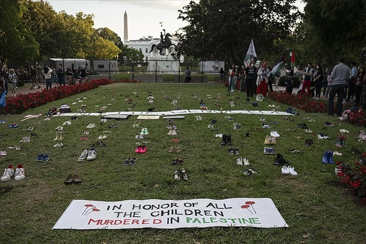 Filistin destekçileri, İsrail'in Gazze'de öldürdüğü çocukları anmak için Beyaz Saray'ın önüne ayakkabılar bıraktı.