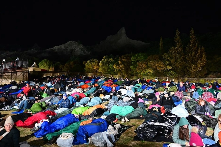 Katılımcılar, uyku tulumları ve battaniyeler içinde tören alanına kurulan dev ekrandan Çanakkale Savaşları'na ilişkin belgeseli izleyerek ayin saatini bekledi.