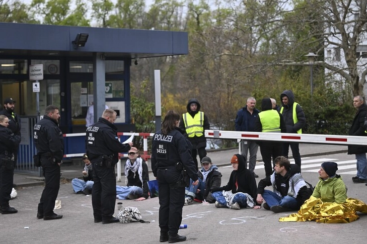 "Soykırıma Karşı Barışçıl Mücadele (Peacefully Against Genocide)" grubu üyesi aktivistler Berlin’in Wedding semtindeki Rheinmetall tesisinin girişinde oturma eylemi yaptı.