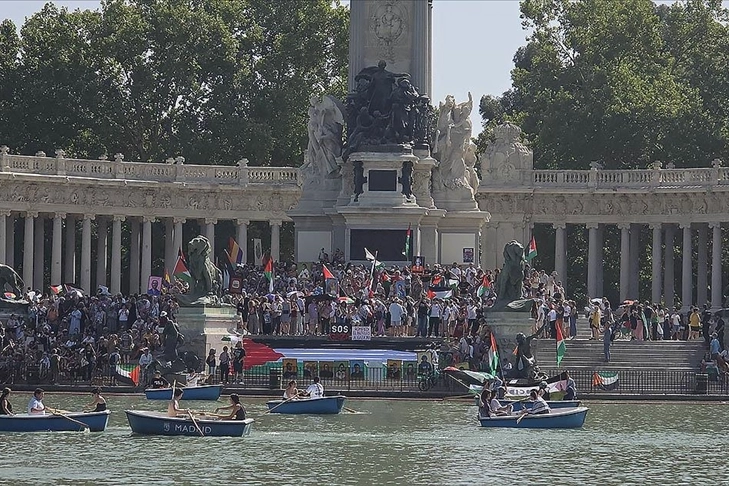 Bazı sivil toplum kuruluşlarının çağrısıyla yapılan gösteriler kapsamında Madrid'in ünlü Retiro Parkı'ndaki Alfonso XII Anıtı önünde toplanan kalabalık, İsrail'in Filistin'deki soykırımını protesto etti.