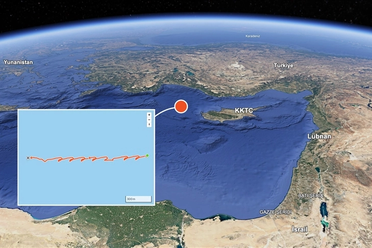 Geminin Kıbrıs'ın kuzeyinde Türkiye'den 100 kilometre açıkta olduğu görüldü.