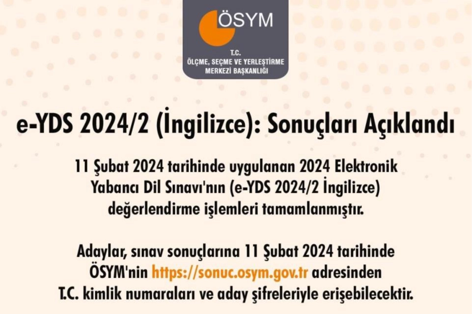 ÖSYM’den yapılan açıklamaya göre, 11 Şubat tarihinde uygulanan 2024 Elektronik Yabancı Dil Sınavı'nın değerlendirme işlemleri tamamlandı. Adaylar, sınav sonuçlarına ÖSYM'nin https://sonuc.osym.gov.tr adresinden T.C. kimlik numaraları ve aday şifreleriyle erişebilecek.