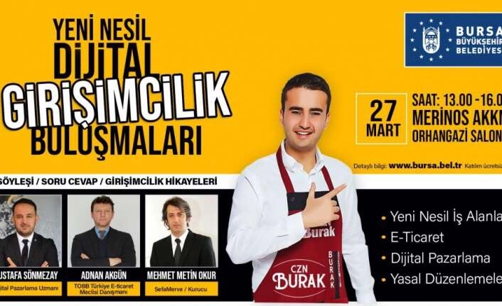 almak isteyen girişimcilere yol haritası oluşturmayı hedefleyen Bursa Büyükşehir Belediyesi, şimdi de Yeni Nesil Dijital Girişimcilik Buluşmaları düzenliyor. Yeni Nesil Dijital Girişimcilik Buluşmaları ile Bursa’da yaşayan gençler, kadınlar ve özellikle girişimci olmak isteyenler için yeni girişimcilik modeli olarak adlandırılan dijital (internet) girişimciliği tanımlayıp, bir internet girişimcisi profili oluşturarak, dijital platformlarda gelecekte yapılacak uygulamalı çalışmaların ihtiyaç duyacağı teorik altyapının oluşturulması hedefleniyor. Merinos Atatürk Kongre ve Kültür Merkezi Orhangazi Salonu’nda 27 Mart Pazar günü yapılacak ve katılımın ücretsiz olduğu program, saat 13.00’da başlayacak. Türkiye Odalar ve Borsalar Birliği Türkiye E-Ticaret Meclisi Danışmanı Adnan Akgün ve Dijital Pazarlama Uzmanı Mustafa Sönmezay, Dijital Girişimcilik ve Yeni Nesil İş Alanları, Türkiye'nin Girişimcilik Haritası, Proje ve Fikir Geliştirme Süreçleri, İnfluencer (Etkileyici) Pazarlama, Sosyal Medya Pazarlama, E-Ticaret Yönetimi, E-ihracat, Dijital Pazarlama, Pazaryeri, Yasal Düzenlemeler, Şirket Kuruluşu ve Dijital Girişim Başarı Hikâyeleri hakkında sunum yapacak.
