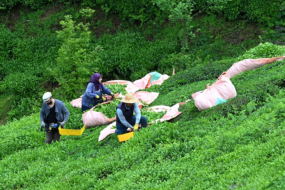 Doğu Karadeniz'de yaş çay sezonunun birinci sürgün döneminin başlamasıyla bahçeye giren Trabzonlu üreticiler, bereketli sezon geçirmek için ter döküyor.