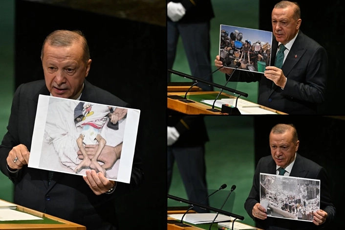 Cumhurbaşkanı Recep Tayyip Erdoğan, New York'ta düzenlenen BM 80. Genel Kurulunda yaptığı konuşmada, İsrail'in 2 yıldır soykırım ve etnik temizlik suçları işlediği Gazze Şeridi'ndeki insani felaketi belgeleyen fotoğrafları gösterdi.