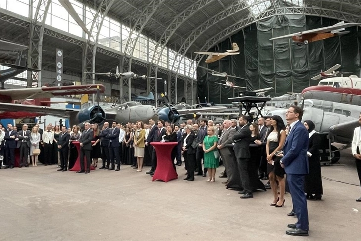 Türkiye'nin Brüksel Büyükelçisi Bekir Uysal ile Askeri Ataşe Kurmay Albay Dr. Çağrı Sağıroğlu ve eşi Dilek Sağıroğlu'nun ev sahipliğinde Belçika Kraliyet Askeri Müzesi Havacılık Salonu'nda verilen resepsiyon, saygı duruşu, İstiklal Marşı ve Belçika milli marşının okunmasıyla başladı.