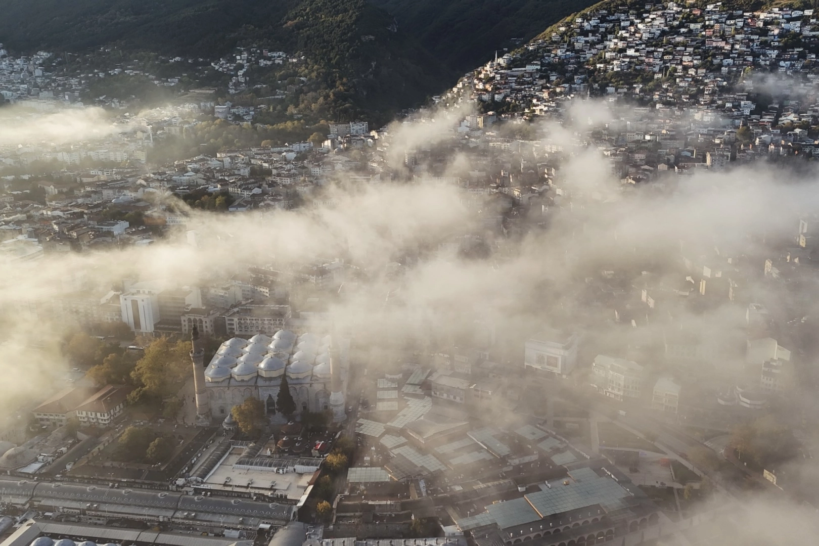 Drone ile havadan görüntülenen Bursa'da binalar sis bulutlarının arasında kaybolurken, pamuklara bürünmüş bir Bursa gibi izleyenleri mest etti. Bursa'nın simgesi olan Ulu Cami, Tophane ve önemli tarihi mekanların sis altındaki görüntüleri büyüledi. Ortaya çıkan görsel şölen, izleyenler tarafından büyük beğeni kazandı.