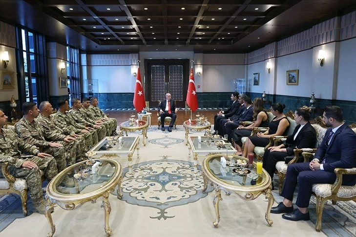 Cumhurbaşkanı Recep Tayyip Erdoğan, dün Cumhurbaşkanlığı Külliyesi'nde düzenlenen 30 Ağustos Zafer Bayramı Özel Konseri öncesinde, Paris 2024 Olimpiyat Oyunları'nda madalya kazanan bazı sporcular ile ABD Kara Kuvvetleri Avrupa ve Afrika Komutanlığınca 4-12 Ağustos'ta Almanya'da gerçekleştirilen, 19 ülke ve 36 timin katıldığı, "8'inci Avrupa En İyi Keskin Nişancı Timi Yarışması"nda şampiyon olan Kara Kuvvetleri Komutanlığı ile ikinci olan Özel Kuvvetler Komutanlığı takımlarından askerlerle bir araya geldi.