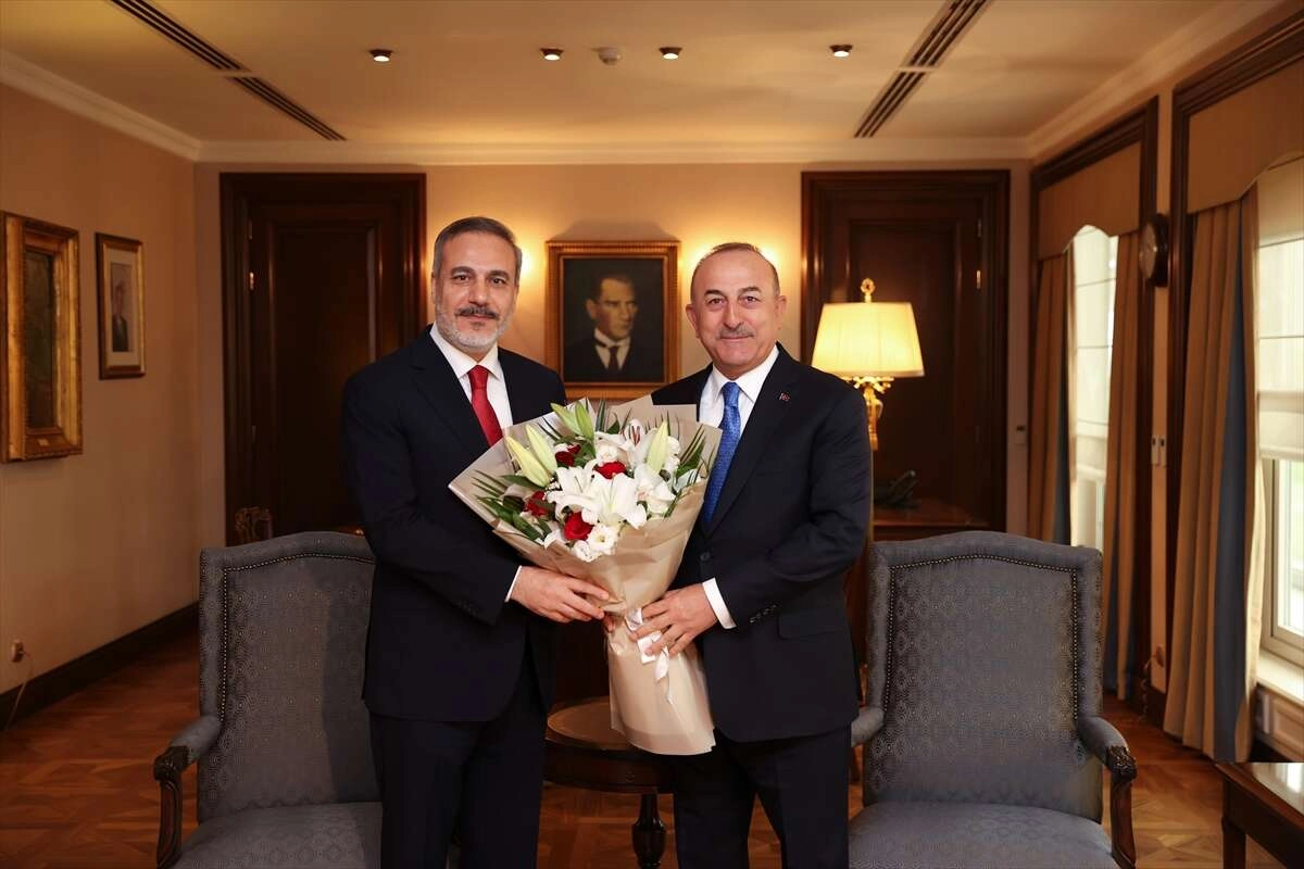 Dışişleri Bakanlığında düzenlenen devir teslim töreninde Çavuşoğlu ve Fidan, birbirine çiçek takdim etti.