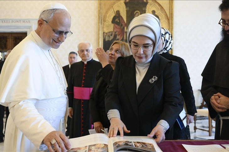 Papalık Sosyal Bilimler Enstitüsü'nde gerçekleşecek "Kardeşlik Temelli Ekonomi: Etik Çoktaraflılık" başlıklı etkinlikte konuşmak üzere Vatikan'da bulunan Emine Erdoğan, Vatikan Apostolik Sarayı'nda Papa 14. Leo ile de görüşme gerçekleştirdi.