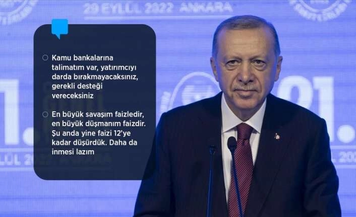 TESK Genel Başkanı Bendevi Palandöken'in esnaf ve sanatkarlara verilen faiz indirimli kredinin tutarının 500 bin liraya yükseltilmesi talebinin aşılamayacak bir konu olmadığını vurgulayan Erdoğan, "Ama bir şeyi iyi kavramamız lazım. Beni biliyorsunuz, en büyük savaşım faizledir. En büyük düşmanım faizdir. Şu anda yine faizi 12'ye kadar düşürdük. Yeter mi, yetmez. Bunun daha da inmesi lazım. Şu anda Halkbank Genel Müdürü karşımda duruyor. Merkez Bankamız ile bunları konuştuk, konuşuyoruz. Önümüzdeki Para Politikası Kurulları toplantılarında bunun daha da inmesinin gereğini telkin ediyorum. Tabii aramızda maalesef faiz politikasını, yüksek faizi savunanlar yok mu? Var. Başta muhalefet olmak üzere onlar da bunu savunuyor ama Cumhurbaşkanınız yüksek faizi savunmuyor, tam aksine düşük faizi savunan bir politika güdüyor. Burada enflasyonla bir mücadelemiz var. İnşallah yılbaşından sonra ben bu enflasyonun da düşük faizle ineceğine inanıyorum ve bunu savunuyorum." diye konuştu.
