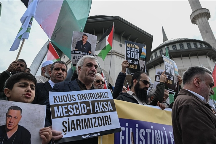 Taksim Camisi önünde cuma namazının ardından ellerinde Filistin bayraklarıyla toplanan kalabalık, "İşgale son", "Esirlere özgürlük", "Mescid-i Aksa ablukasına hayır" yazılı pankart açarak İsrail ve ABD aleyhine sloganlar attı.