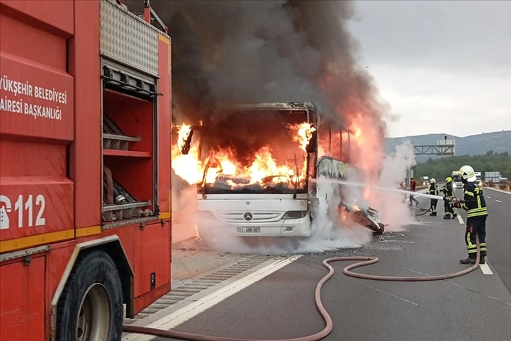 Aracı güvenlik şeridinde durduran sürücü, 30 yolcuyu tahliye edip durumu 112 Acil Çağrı Merkezi'ne bildirdi.