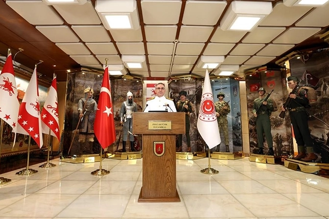 Milli Savunma Bakanlığı (MSB) Basın ve Halkla İlişkiler Müşaviri ve Bakanlık Sözcüsü Tuğamiral Zeki Aktürk, Kara Kuvvetleri Komutanlığında düzenlenen basın bilgilendirme toplantısında konuştu.
