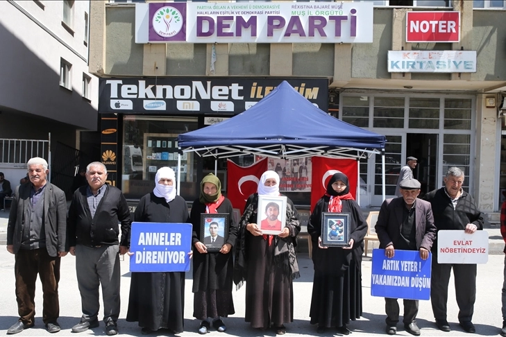 Aileler, "Anneler direniyor", "Evlat nöbetindeyiz" ve "Artık yeter yakamızdan düşün" yazılı pankartlar açarak DEM Parti ve terör örgütü PKK'ya tepki gösterdi.