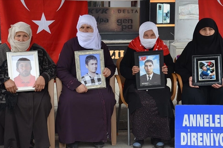 "Anneler direniyor", "Evlat nöbetindeyiz" ve "Artık yeter, yakamızdan düşün" yazılı pankartlar açan anne babalar, DEM Parti ve terör örgütü PKK'ya tepki gösterdi.